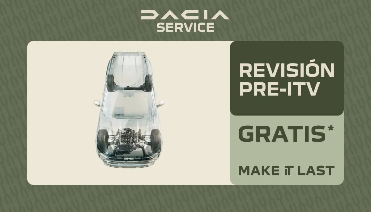 *Promoción válida hasta el 31 de diciembre de 2025, aplicable a turismos de más de cuatro años de antigüedad y para vehículos mixtos o de transporte de mercancías a partir de dos años. Para ayudarte a pasar la ITV te ofrecemos la posibilidad de realizar un control de tu Dacia de manera gratuita. Los puntos a revisar son: 1. Identificación N.º de bastidor y matrícula. 2. Acondicionamiento exterior: carrocería y chasis, estado carrocería, estado limpias y lavaparabrisas, elevalunas y retrovisores. 3. Acondicionamiento interior: Asientos y anclajes, cinturones de seguridad y anclajes, dispositivos de retención para niños, antihielo y antivaho, antirrobo y alarma, indicador de velocidad y cuentakilómetros. 4. Alumbrado y señalización: Luces de cruce y carretera, luces marcha atrás, intermitentes y luces de emergencia, luces de frenado, luz placa matrícula, luces de posición y antiniebla, alumbrado interior. 5. Frenos. 6. Dirección: Desviación de ruedas, rótulas dirección. 7. Ejes, ruedas, neumáticos y suspensión: Ejes, estado y presión de los neumáticos, suspensión. 8. Motor y transmisión: Estado general motor, sistema aceleración, línea escape, transmisión. No compatible con otras promociones.