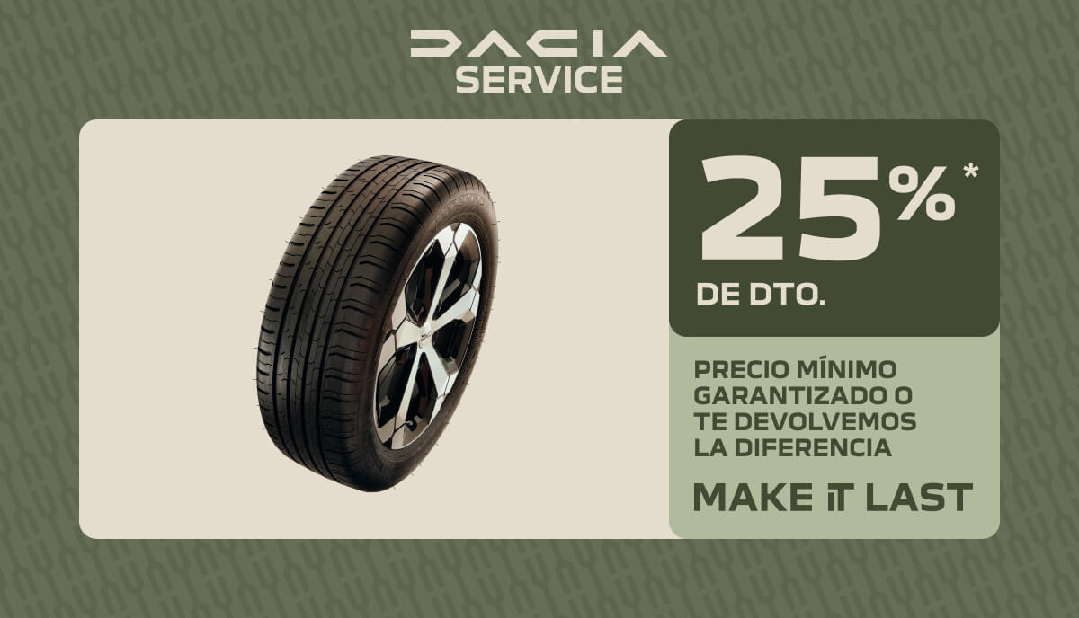 * Descuento de hasta un 25% de descuento en las referencias más vendidas y el resto al 20%. El descuento no aplica a precio de mano de obra o a cualquier coste reflejado en factura. Devolución por la diferencia de precio de la intervención de cambio de neumáticos hasta 15 días después de realizar la operación, presentando un presupuesto por escrito con la identificación fiscal de la compañía que lo ofrece de exactamente la misma operación en un radio inferior a 10 km alrededor de la instalación Dacia donde se realice el cambio de neumáticos. Para más información consulta en tu Punto de Red.